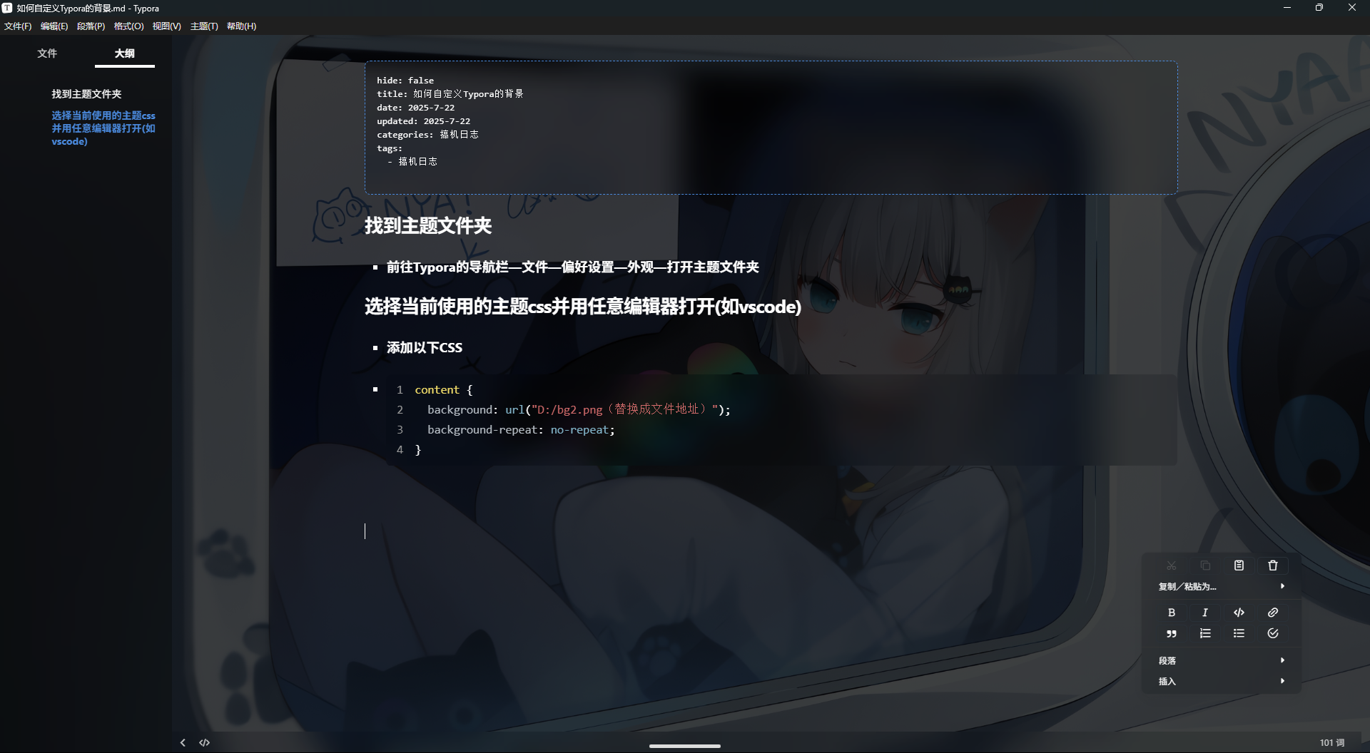 - 前往Typora的导航栏—文件—偏好设置—外观—打开主题文件夹